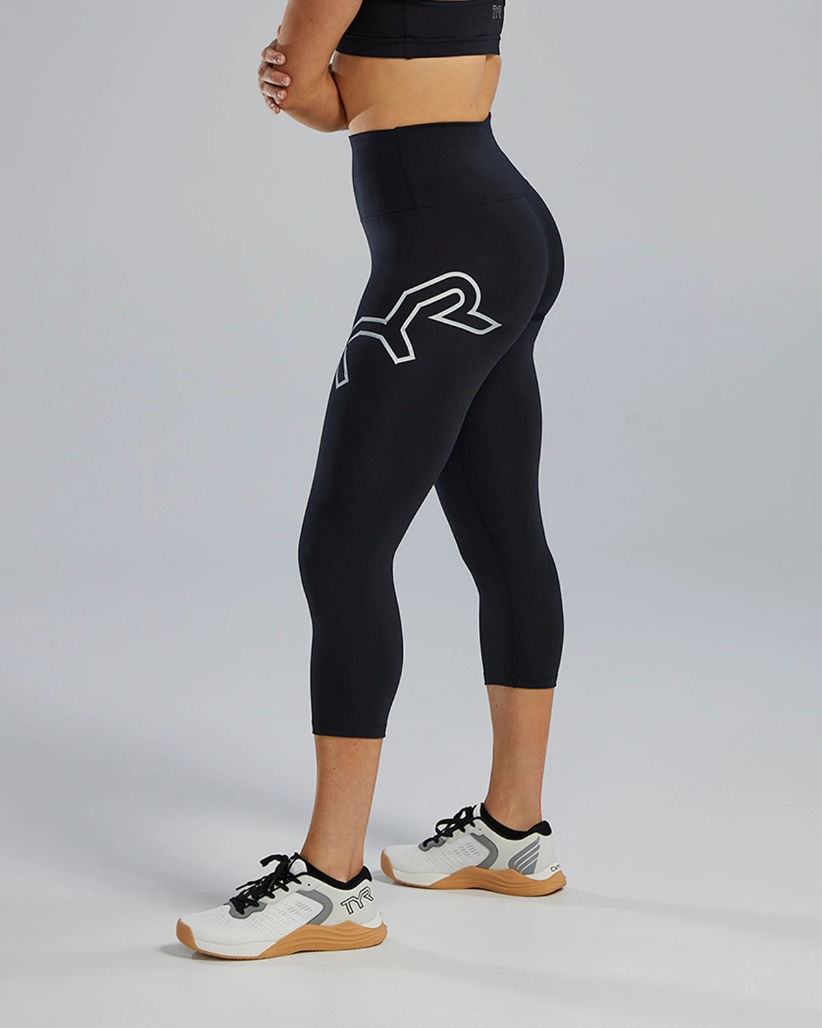Conquer your regimen with TYR Base Kineticâ„¢ Women’s High-Rise 3/4 Logo Leggings – Solid.