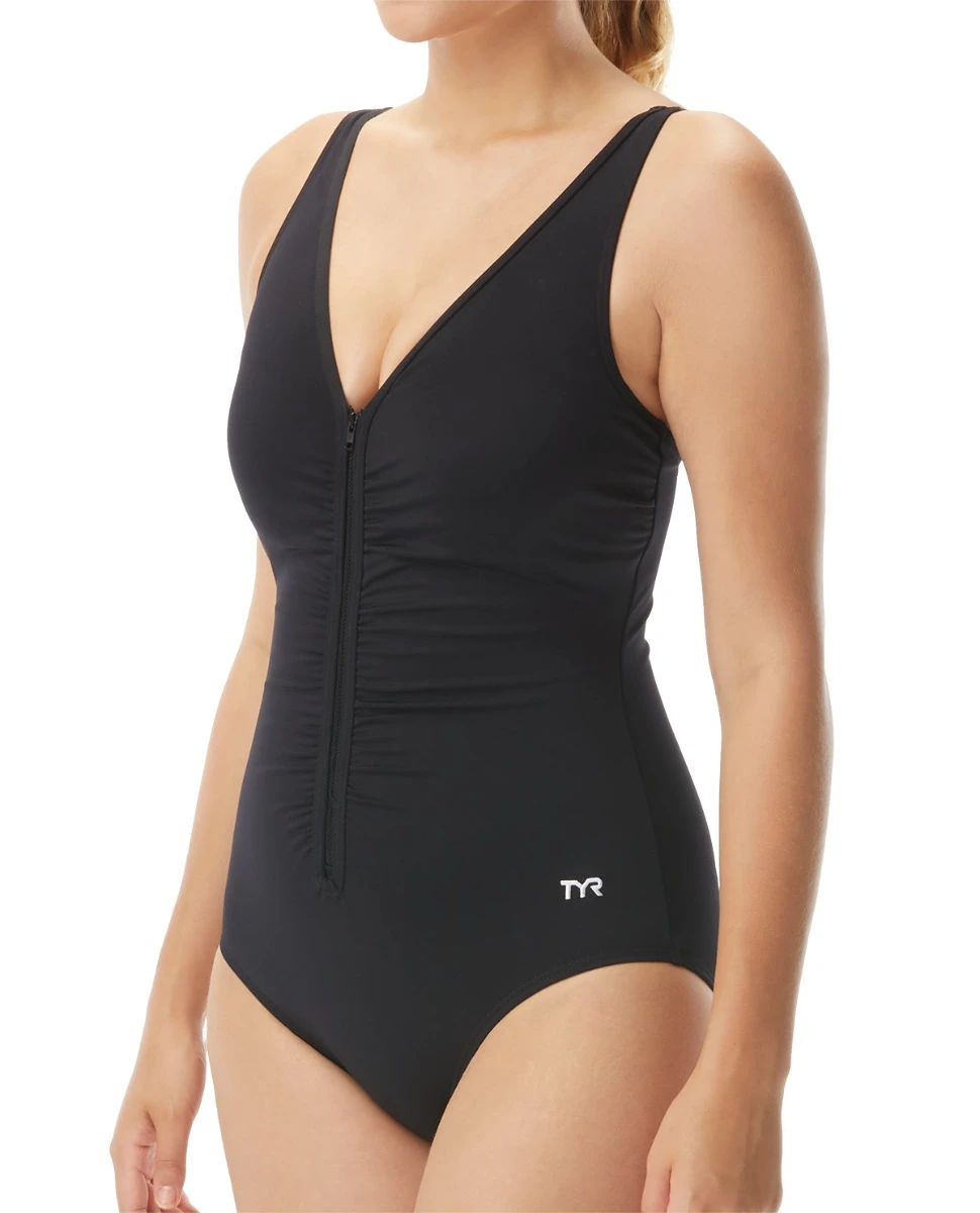 When keeping fit is the priority, you need swimwear designed for your needs. The TYR Women’s Solid V-Neck Zip Controlfit, an ideal combination of flattering coverage and durability, will help you to more comfortably enjoy every aquatic experience. In addition to featuring UPF 50+ technology for superior sun protection, this fully lined swimsuit includes a low neckline, supportive adjustable straps, front zip closure and modest coverage on the body.